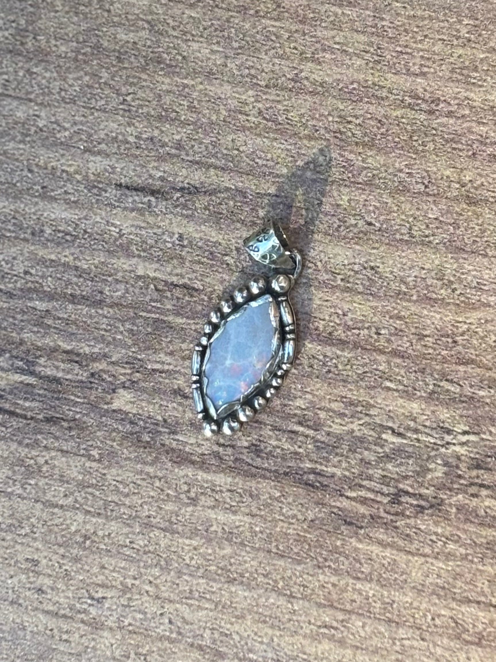 This elegant marquise-shaped pendant features a fiery Australian opal cabochon bezel set in .925 sterling silver, blending vibrant color play with Southwestern elegance. Designed for versatile styling—pair it with your favorite chain for a custom look. Using natural Australian opal, each piece is truly one-of-a-kind.