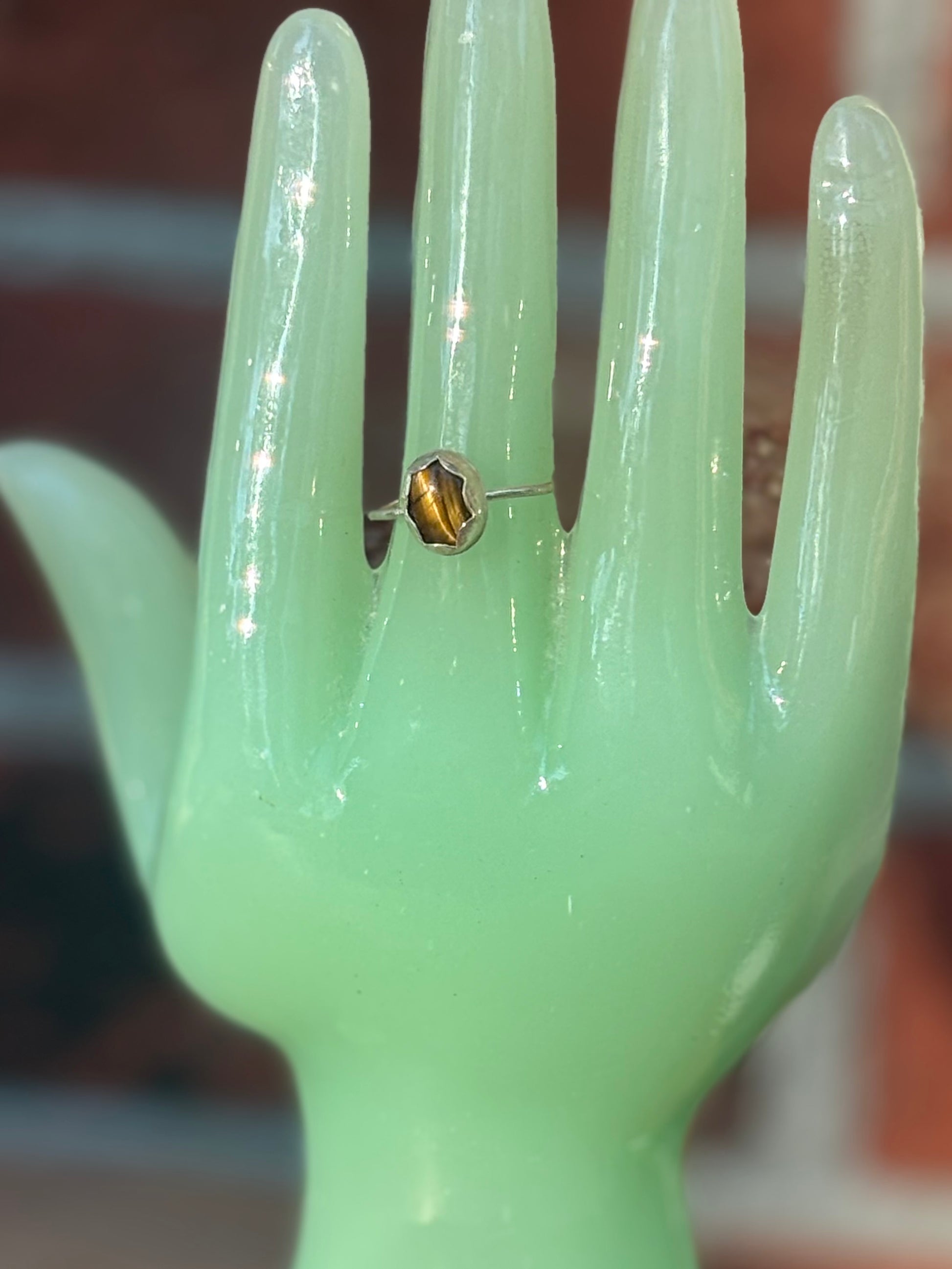 This dainty ring features a warm tigers eye cabochon bezel set in .925 sterling silver, blending subtle chatoyancy with Southwestern elegance. Crafted in a fixed size 7.5 for a comfortable fit. Using natural tigers eye, each ring is truly one-of-a-kind.