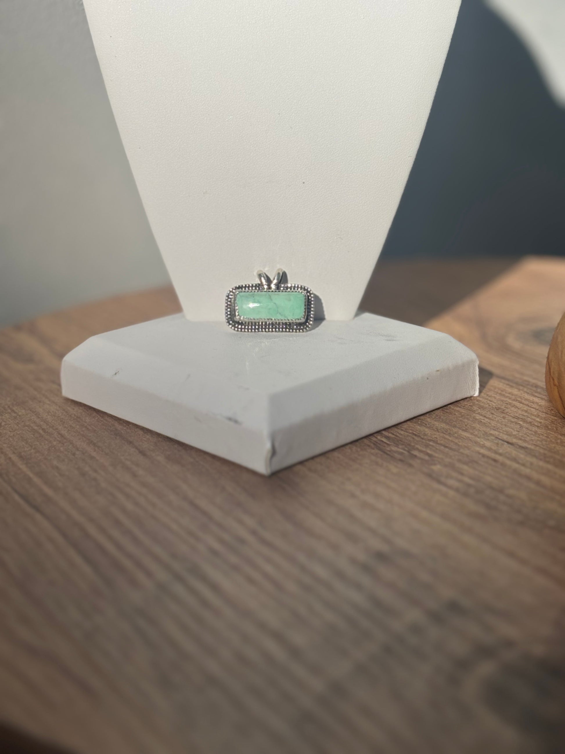 A refined pendant showcasing a slim rectangle of light blue turquoise, free of green tones, bezel-set in polished 925 sterling silver. The clean lines and soft sky-blue hue create subtle elegance. Hypoallergenic, tarnish-resistant bail ready for your favorite chain (chain sold separately). Perfect for minimalist layering or solo wear.