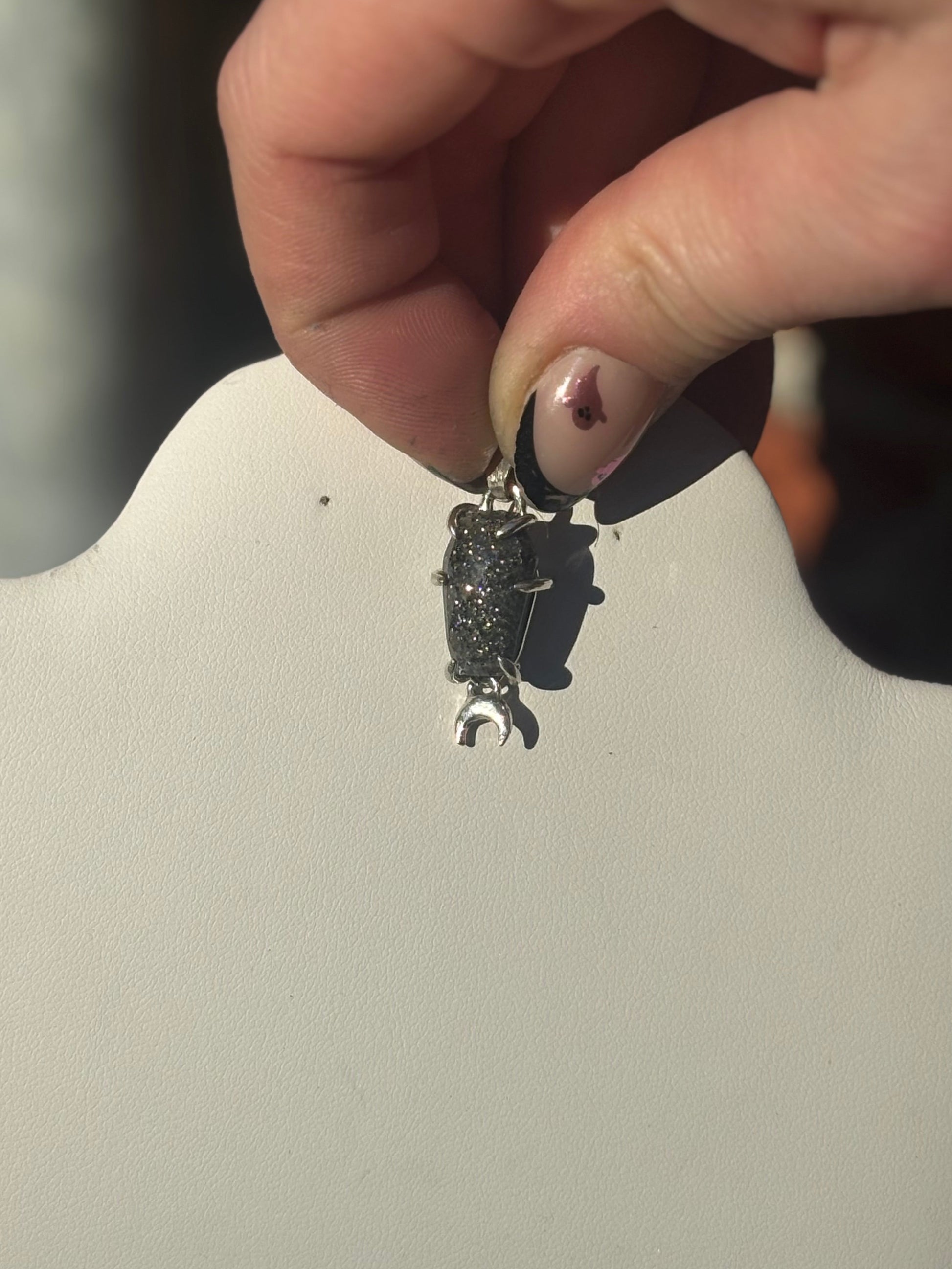 This striking coffin-shaped pendant features deep midnight quartzite bezel set in .925 sterling silver with a delicate crescent moon dangle, blending gothic elegance with Southwestern mystique. The pendant drop measures about 2.5 inches and is designed for versatile styling—pair it with your favorite chain for a custom look. Using natural quartzite, each piece is truly one-of-a-kind.