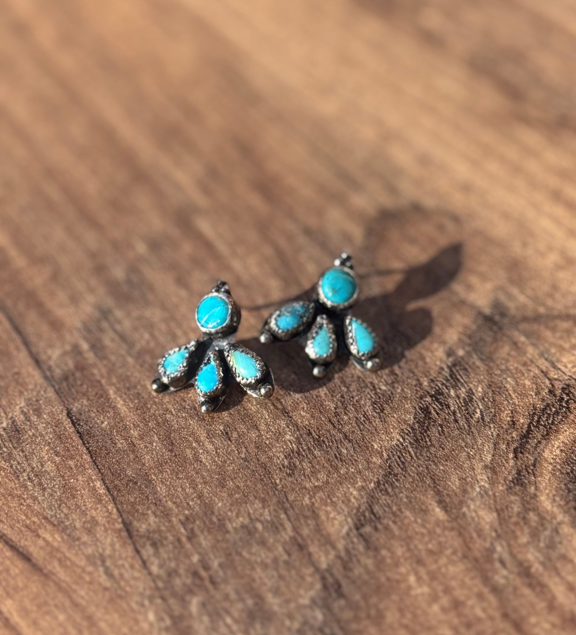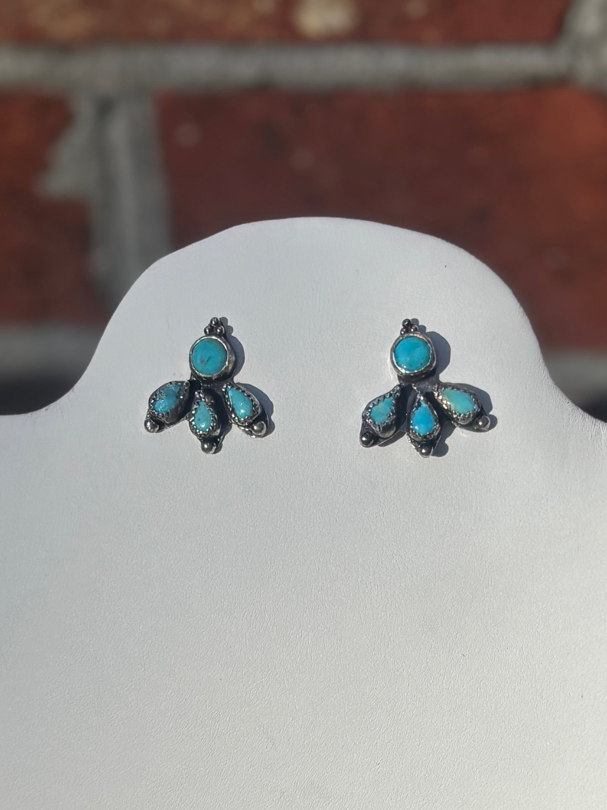 These petite fan-shaped studs feature smooth turquoise cabochons bezel set in .925 sterling silver, blending Southwestern charm with modern minimalism. Designed for everyday wear with secure push-back closures, each pair is truly one-of-a-kind thanks to natural turquoise variations.