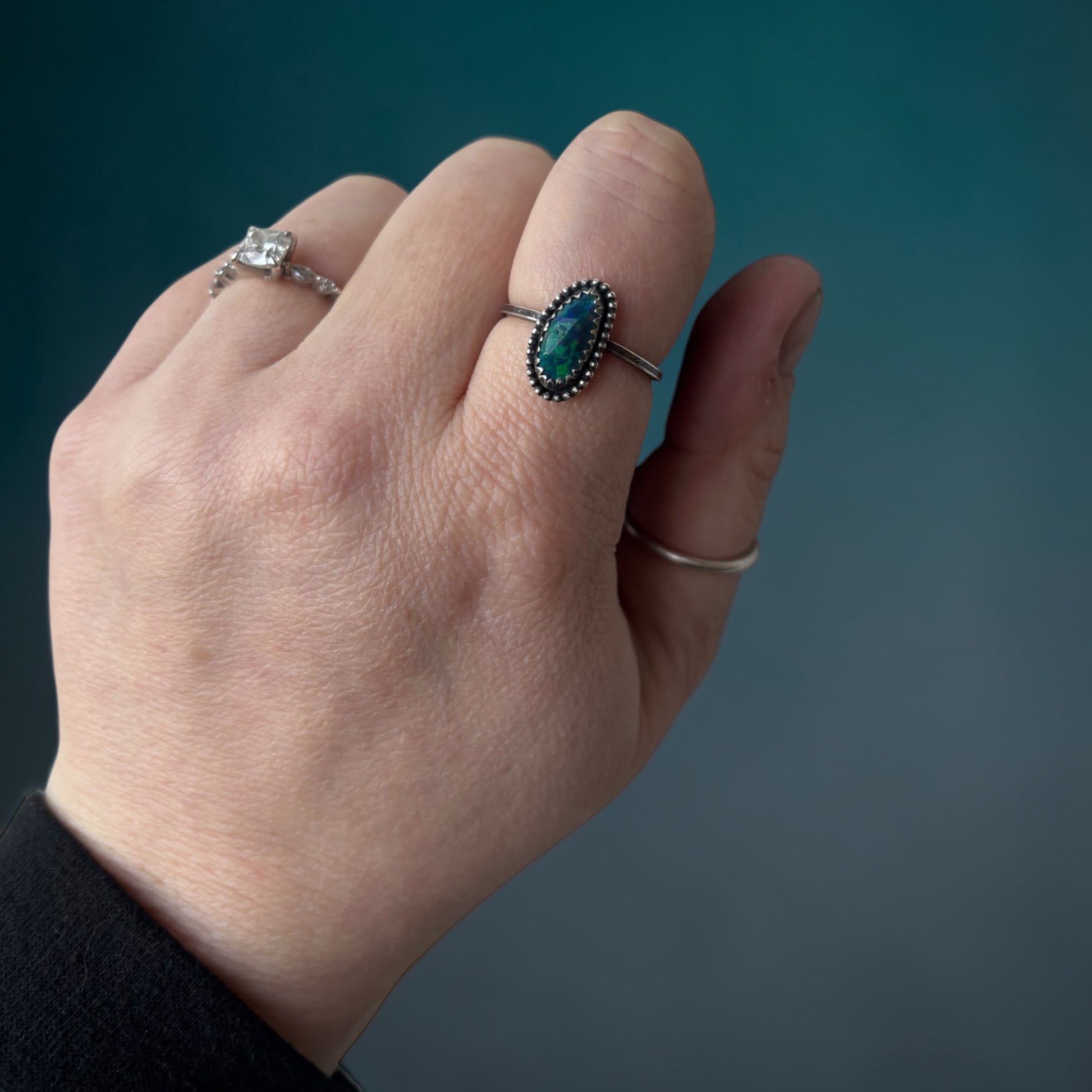This ring has a moody, ethereal vibe that’s perfect for bohemian outfits, minimalist stacks, or standalone wear. The smoked treatment gives it the dramatic look of rare black opal at a more approachable price point, while the natural flashes keep it full of life and personality.